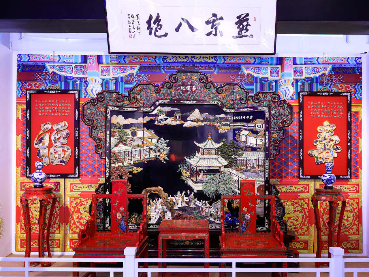 「燕京八絶」とは、清代の宮廷造弁処(宮廷の工房)の職人が宮廷を追い出され放浪した後、次第に形成されていった金漆象嵌、花糸象嵌、七宝焼き、象牙彫刻、玉彫刻、堆朱、北京刺繍、北京緞通を代表とする8つの技巧である。