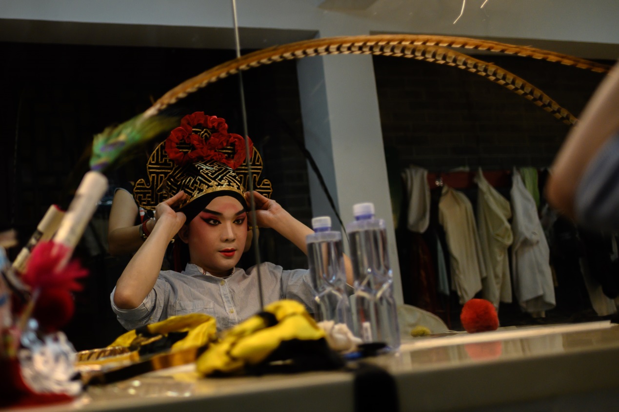冠をかぶる京劇役者