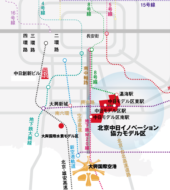 中日モデル区は北京市の南部平原の中心に位置し、北京大興国際空港を通じて世界の主要都市にアクセスできる。総計画面積は約10平方キロメートルで、十分な発展空間を擁し、さまざまなスタートアップ企業に成長支援拠点とチャンスを提供している。約4平方キロメートルの産業用地、200万平方メートル以上の高水準の商業オフィスビル、300万平方メートル以上のハイエンドな研究開発・生産用標準工場を擁し、様々な発展ニーズに対応し、企業の質の高い発展に強力な発展支援能力を備えている。