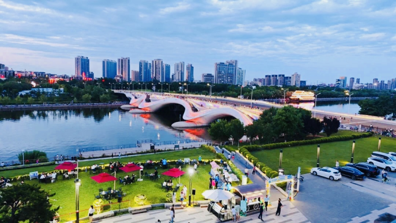 通利福尼亜ナイトマーケットでは、ビール、ザリガニ、ピーナッツ、枝豆、手羽先焼き、ホタテと春雨のニンニク蒸しなどの各種グルメが楽しめるほか、河川敷や千荷瀉露大橋を散歩したり、遊覧船に乗って大運河沿いの景色を観覧したりすることができる。
