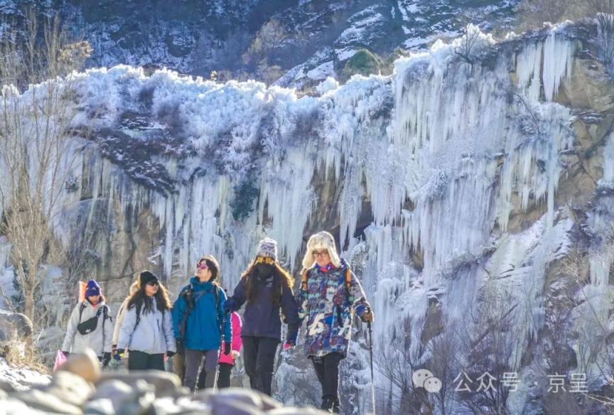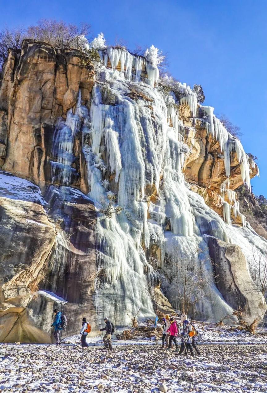 懐柔区雲夢仙境景勝地の白河岸辺にある山の岩にそびえ立つ高さ10メートル以上の氷瀑。きらきら輝く透明な氷瀑と氷河が織りなす美しい光景を多くの観光客が写真に収めている。