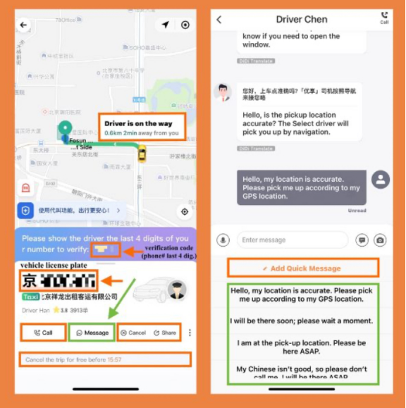 - 「連絡を取る」をタップしてドライバーに直接連絡を取り、リアルタイムにコミュニケーションを取れます。特に予約したときに入力した乗車位置と実際に待っている場所が少し違っている場合(例えば、通りの向かいにいる場合)には便利です。とはいっても、ほとんどのドライバーが中国語しか使えません。