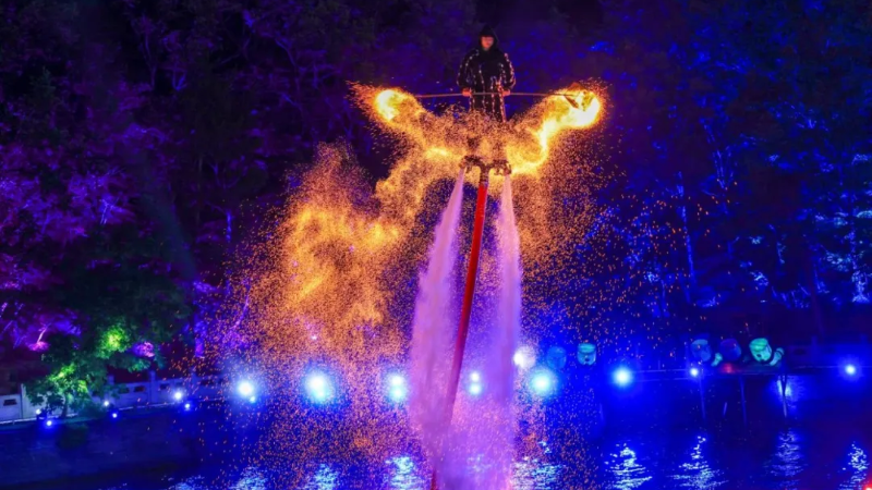 夕方になると、梨樹溝ナイトツアーが予定通りに開催され、大型実景ウォーターショー「平谷夜話」が上演され、現代的な舞台美術技術を駆使した、音楽や噴水、照明、レーザー、プロジェクションなどの要素が融合した光と影の饗宴を堪能できる。